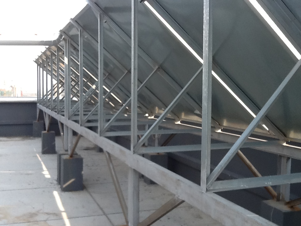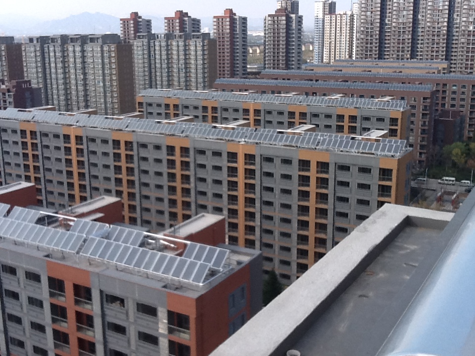 本工程他为“集中集热、分户蓄热”太阳能系统,太阳能集热面积2000多平方米,为1000多户业主提供生活热水。本系统屋面太阳能集热器收集热量,通过一次侧和二次侧的换热系统,只给业主室内水箱提供热源,太阳能热力不足部分,由业主室内水箱电辅提供。